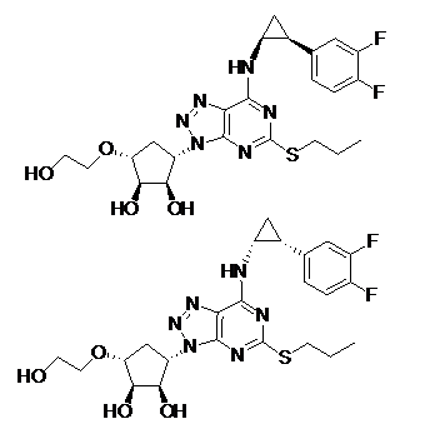 | ALIAS | (1R,2R,3S,5R)-3-(7-(((1R,2S)-2-(3,4-difluorophenyl)cyclopropyl)amino)-5-(propylthio)-3H-[1,2,3]triazolo[4,5-d]pyrimidin-3-yl)-5-(2-hydroxyethoxy)cyclopentane-1,2-diol and (1R,2R,3S,5R)-3-(7-(((1R,2R)-2-(3,4-difluorophenyl)cyclopropyl)amino)-5-(propylthio |