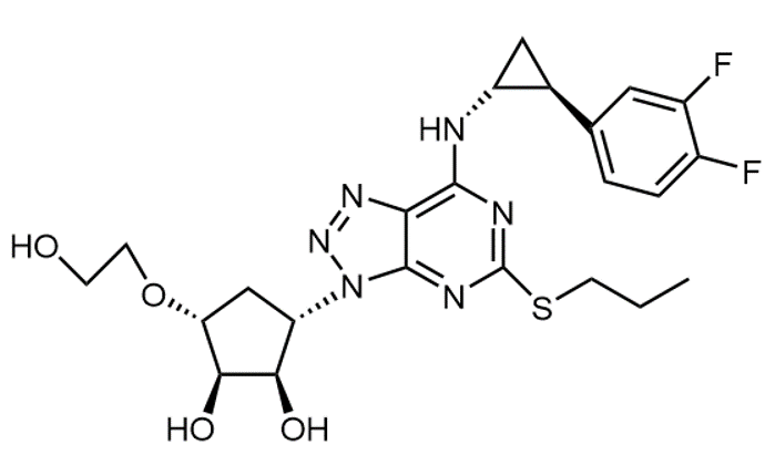 | ALIAS | (1R,2R,3S,5R)-3-(7-(((1R,2S)-2-(3,4-difluorophenyl)cyclopropyl)amino) -5-(propylthio)-3H-[1,2,3]triazolo[4,5-d]pyrimidin-3-yl)- 5-(2-hydroxyethoxy)cyclopentane-1,2-diol |