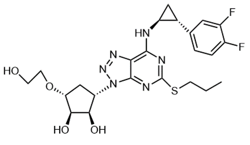 | ALIAS | (1R,2R,3S,5R)-3-(7-(((1S,2R)-2-(3,4-difluorophenyl)cyclopropyl)amino)-5-(propylthio)-3H-[1,2,3]triazolo[4,5-d]pyrimidin-3-yl)-5-(2-hydroxyethoxy)cyclopentane-1,2-dio |
